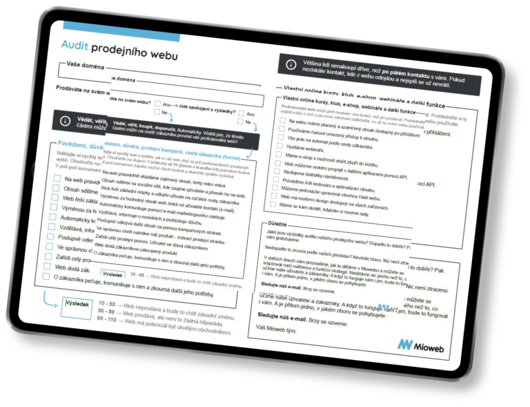 (v případě Miowebu je to například checklist k prodejnímu webu, protože předpokládáme váš zájem zjednodušení prodeje na internetu).