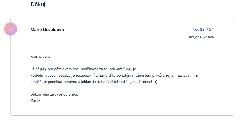 Mioweb mě baví a moc. Pomohl mi velmi hladce rozjet mé podnikání. Po krátkém seznámení se s jeho fungováním, protože všechno se musíme nejdříve naučit, ale tady to fakt nebolí, jsem sama schopná velmi jednoduše a rychle tvořit, upravovat a měnit své webové stránky podle mých představ. A jestli bych ho doporučila? Ano. Vám, kteří chcete tvořit své stránky samostatně, vám, kteří chcete, aby váš web vypadal atraktivně a profesionálně a v neposlední řadě vám, kteří chcete šetřit svůj vzácný čas.